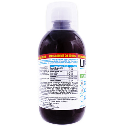 Apports nutritionnels pour 25 ml : Extrait de guarana : 150 mg dont caféine : 15 mg ; Extrait de thé vert : 11,25 mg dont caféine : 0,78 mg dont EGCG : 5,06 mg ; Vitamine B3 : 16 mg ; Chrome : 120 µg ; Extrait de fucus : 20 mg