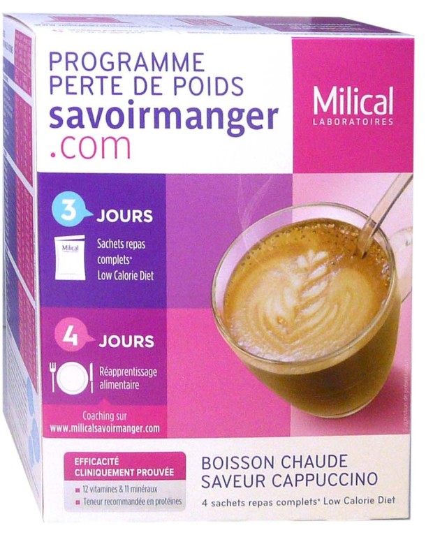 Le laboratoire MILICAL propose des compléments alimentaires, boissons, biscuits,… aux actions minceurs, drainantes,… élaborés par des nutritionnistes. La boisson chaude saveur Cappuccino est à consommer dans le cadre du régime alimentaire « savoirmanger.com de MILICAL en se substituant au repas journalier. Cette boisson chaude à la saveur Cappuccino est conseillée pour la perte du poids progressive et durable tout en prenant soin de sa santé. Riche en 11 vitamines, 12 minéraux et en protéines de haute qualité nutritionnelle, la boisson chaude au cappuccino avec sucres et édulcorants, est pauvre en matières grasses et en sucres et ne contient que 200 calories par repas pour des résultats efficaces sur le programme minceur. Avec sa saveur gourmande, la prise de cette boisson sera un vrai plaisir pour atteindre son objectif ! Cette préparation en sachet est facile et rapide à préparer pour un repas savoureux ! En seulement quelques jours, la taille va s’affiner et les kilos superflus disparaitront.