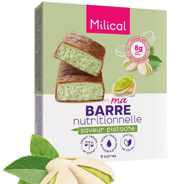 Les barres hyperprotéinées MILICAL, la solution gourmande pour allier équilibre alimentaire et plaisir, saveur chocolat pistache.