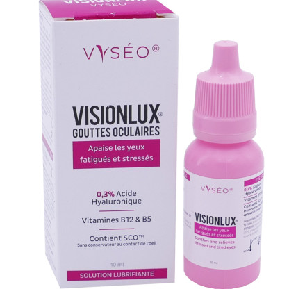 VYSEO est une marque du laboratoire français Yneo Pharma qui propose des produits ophtalmologiques pour hydrater, protéger, et apaiser les yeux irrités ou secs, lors de fatigue oculaire ou de paupières sensibles. Visionlux Gouttes oculaires de VYSEO est une solution oculaire sous forme de compte-gouttes, composée de hyaluronate de sodium (d’origine non animale) dosé à 0,3%, d’électrolytes (chlorures, sodium, potassium, calcium et magnésium) et de vitamines (B12, B5), qui va apaiser dès la première utilisation les yeux secs, fatigués et irrités, protéger des agressions extérieures quotidiennes (poussières, fatigue visuelle,…), hydrater intensément pour reformer le film lacrymal en se rapprochant des larmes naturelles, et ainsi préserver l’eau autour de l’œil pour une hydratation en continu et un confort durable. Visionlux dispose d’un système spécial de conservation (SCO) qui permet de préserver la stérilité de la solution afin de diluer les composants au contact de l’œil sans irriter les yeux. Pratique, il n’est pas nécessaire d’enlever les lentilles de contact pour mettre les Gouttes ophtalmiques.