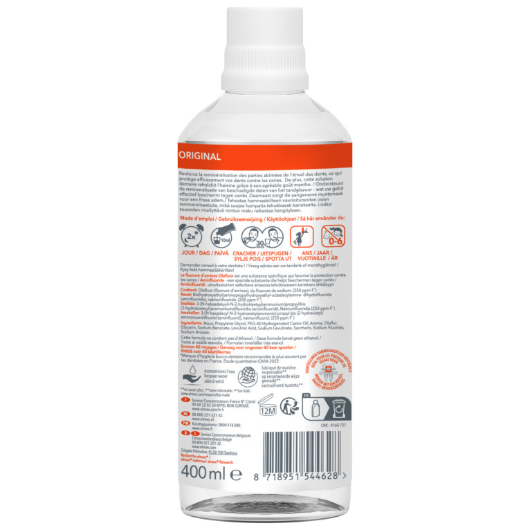 Le laboratoire ELMEX a conçu des produits d’hygiène dentaires reconnus par des dentistes pour des soins d’hygiène bucco-dentaire, blancheur des dents, prévention caries,… ANTI-CARIES SOLUTION DENTAIRE d’ELMEX permet de nettoyer les endroits où une brosse à dents ne peut pas aller et de protéger l’émail des dents contre les caries. Spécialement destinée aux adultes et enfants à partir de 6 ans, elle est composée de fluorure d’amines Olafluor, pour empêcher les attaques d’acides de sucre de la plaque dentaire d’abîmer l’émail, pour éviter la formation de caries et renforcer les dents. Sans alcool, goût agréable, ANTI-CARIES SOLUTION DENTAIRE d’ELMEX reminéralise les dents en laissant un voile frais et protecteur. Les dents sont plus résistantes aux attaques de sucre et à la formation de caries en complément d’un brossage des dents au quotidien. Idéal pour les porteurs de bagues orthodontiques.