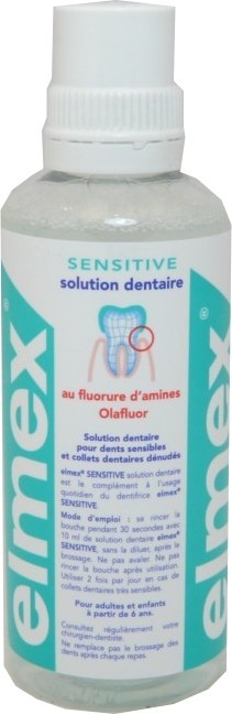 ELMEX Solution dentaire sensitive est un produit spécialement conçu pour apporter une réponse efficace aux problèmes de sensibilité dentaire. En effet, l’usure de l’émail ou une rétractation des gencives peuvent engendrer une mise à nue des collets dentaires et de la dentine, provoquant une sensibilité douloureuse au contact des aliments chauds, froids, acides ou sucrés. ELMEX solution dentaire sensitive est composée de fluorure d’amines Olafluor capable de former une barrière protectrice sur les collets dénudés, et assure une protection efficace contre les caries du collet dentaire.