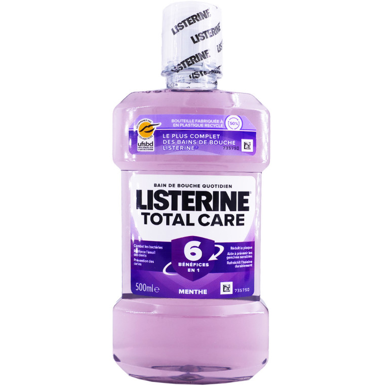 Le bain de bouche Total Care de LISTERINE est spécialement conçu pour assurer une hygiène bucco-dentaire globale et offrir une protection efficace de l’émail dentaire. Il élimine également les bactéries responsables de la plaque dentaire, rafraîchit l’haleine, respecte l’équilibre de la flore buccale. LISTERINE Total Care, composé de fluor, et utilisé en complément du brossage quotidien, élimine jusqu’à 99,9% des bactéries buccales délétères, notamment dans les endroits difficilement atteignables par la brosse.