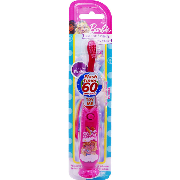 La brosse à dents Flash Timer discount de TINOKOU, la brosse à dents avec témoin lumineux adaptée pour les tout-petits dès 3 ans à l’effigie des personnages de dessins animés pour plaire aux enfants pour une hygiène bucco-dentaire optimale dès le plus jeune âge ! Dans votre parapharmacie en ligne à prix discount. « Barbie »