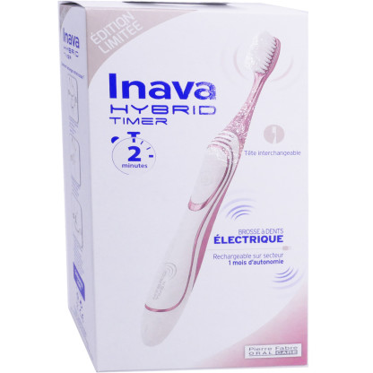 La marque INAVA est composée de produits d’hygiène bucco-dentaires (brossettes, brosse à dents, fil dentaire) destinés à toute la famille. Brosse à dents HYBRID TIMER d’INAVA est un système de brossage ingénieux. Il permet un brossage manuel ou électrique. Avec le mode électrique, la brosse bénéficie de la technologie sonique qui va par des vibrations haute fréquence sur les brins, éliminer 10 fois plus de plaque dentaire même dans les endroits difficiles d’accès qu’une brosse à dents classique. Les brins des têtes interchangeables HYBRID en Tynex doux permettent un nettoyage tout en douceur sans agresser l’émail ni les gencives. Légère et ergonomique cette brosse à dents permet une bonne prise en main pendant le brossage et peut être transporté facilement. La brosse à dents HYBRID TIMER se recharge dans le verre afin de ne pas prendre trop de place dans la salle de bains ! La brosse à dents possède un minuteur qui indique le temps de brossage (2 minutes recommandées). Toutes les 30 secondes, la brosse fait de brefs arrêts pour indiquer qu’il faut changer de quadrant, et des arrêts plus prononcés pour indiquer la fin du brossage recommandé. Pratique, les brossettes de recharge peuvent être stérilisées au micro-ondes pendant 1 minute à 600 Watts, pour une hygiène optimale débarrassée de toutes bactéries.