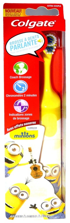 Le laboratoire COLGATE conçoit des produits d’hygiène bucco-dentaire, mais aussi des produits d’hygiène corporels, pour l’entretien de la maison ou encore de la nourriture pour chiens et chats. La brosse à dents électrique parlante aux poils extra souples et à la tête rotative, nettoie en douceur les surfaces des dents en les entourant, élimine la plaque dentaire tout en douceur, et ainsi évite l’apparition de caries qui peuvent se former. Pour un brossage ludique, la voix des « Minions » indique aux enfants le brossage pendant 2 minutes, temps du brossage conseillé. Les enfants peuvent l’utiliser facilement grâce à son manche fin. Ses piles inclues peuvent être remplacées. Se brosser les dents avec les personnages « Minions » rendra le brossage amusant !