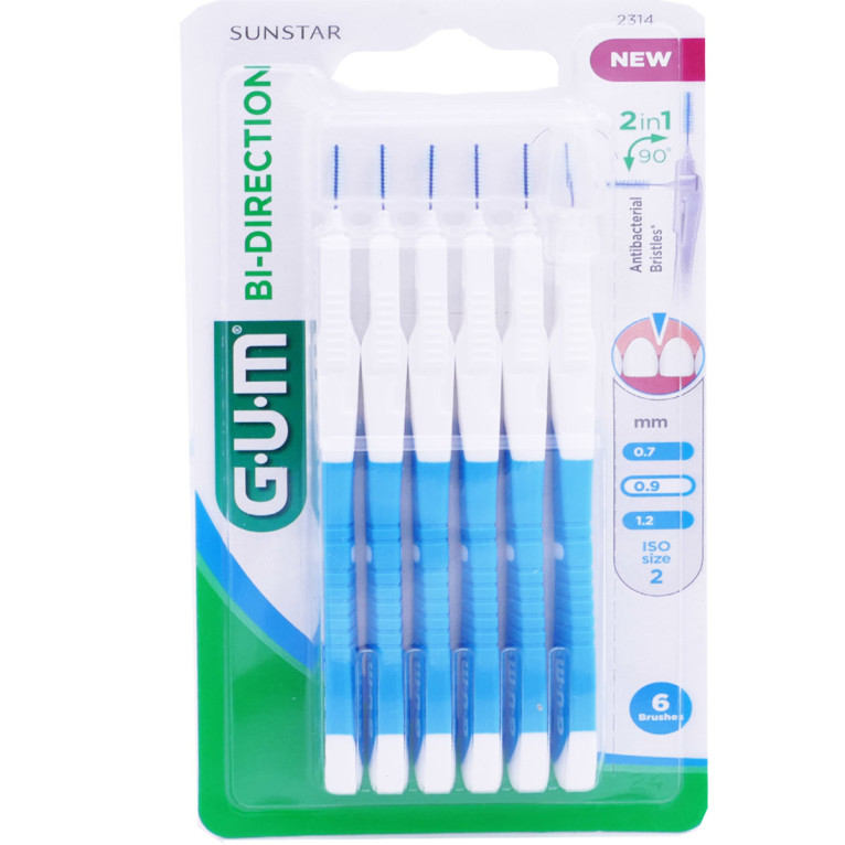 GUM Sunstar, dont le nom évoque le soleil (sun) et les étoiles (stars) puisqu’on se lave les dents au lever du jour et à la tombée de la nuit, développe depuis près d’un siècle des produits de soins buccaux et dentaires révolutionnaires de très grande qualité offrant une réponse adaptée à tous les besoins : brosses à dent, soins inter-dentaires, fils dentaires... La gamme GUM gencives propose des produits spécialement conçus pour maintenir des gencives saines et en bonne santé. Les brossettes interdentaires GUM Bi-Direction assurent un brossage simple et efficace des espaces interdentaires notamment dans les zones les plus difficilement atteignables. Elles sont dotées d’un manche semi-long avec une tête orientable à 180° idéale pour les dents de devants, et à 90° en « L » pour atteindre les dents du fond. Leur tige en nylon et arrondie est extrêmement résistante et prolonge leur durée de vie. Recouverts de chlorhexidine qui est un agent antibactérien, les brins permettent une efficacité optimale du nettoyage interdentaire et du sillon gingival. Leur brins de forme triangulaire éliminent 25% de plaque en plus qu’une brossette aux brins traditionnels. Equipées de capuchon les brossettes restent propres entre 2 utilisations. Leur manche bi-matière ergonomique permet une prise en main optimal. Disponible en trois tailles.