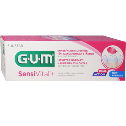 GUM Sunstar, dont le nom évoque le soleil (sun) et les étoiles (stars) puisqu’on se lave les dents au lever du jour et à la tombée de la nuit, développe depuis près d’un siècle des produits de soins buccaux et dentaires révolutionnaires de très grande qualité offrant une réponse adaptée à tous les besoins : brosses à dent, soins inter-dentaires, fils dentaires... La gamme GUM SensiVital propose des produits spécialement conçus pour réduire la sensibilité dentaire. Le dentifrice GUM SensiVital+ réduit de façon significative et soulage la douleur causée par la sensibilité dentaire. Sa formule associe du nitrate de potassium aux propriétés anti-sensibilité cliniquement démontrées, du fluor, de l’écorce d’orange (actif naturel) et de l’isomalt pour renforcer l’émail dentaire prévenir les caries et la plaque dentaire, du Chlorure de Cétylpyridinium anti-bactérien et anti-inflammatoire naturel. Son goût menthe laissera une haleine fraîche pour longtemps. Sans SLS (Sodium Lauryl Sulfate) sans nanoparticules
