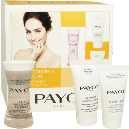 Kit Découverte Eclat de PAYOT, 3 soins regroupés dans un coffret pour une peau nette et sublime : Les Démaquillantes Eau micellaire Express (30ml), My Payot Jour (15ml), My Payot Sleeping Pack (15ml). Toutes peaux