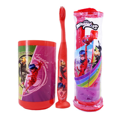 Kit Brosse à dents discount de TINOKOU, 1 brosse à dents et un gobelet réunis dans une jolie trousse de transport, à l’effigie des personnages de dessins animés pour plaire aux enfants pendant le brossage des dents, dans votre parapharmacie en ligne à prix discount. « Miraculous »