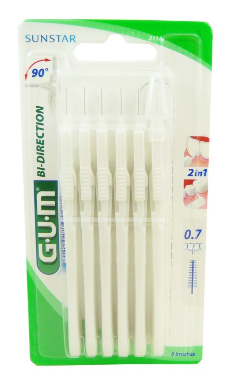 GUM Sunstar, dont le nom évoque le soleil (sun) et les étoiles (stars) puisqu’on se lave les dents au lever du jour et à la tombée de la nuit, développe depuis près d’un siècle des produits de soins buccaux et dentaires révolutionnaires de très grande qualité offrant une réponse adaptée à tous les besoins : brosses à dent, soins inter-dentaires, fils dentaires... La gamme GUM gencives propose des produits spécialement conçus pour maintenir des gencives saines et en bonne santé. Les brossettes interdentaires GUM Bi-Direction assurent un brossage simple et efficace des espaces interdentaires notamment dans les zones les plus difficilement atteignables. Elles sont dotées d’un manche semi-long avec une tête orientable à 90° en position verticale idéale pour les dents de devants, et en « L » pour atteindre les dents du fond. Leur tige en manganèse est extrêmement résistante et prolonge leur durée de vie. Disponible en trois tailles.