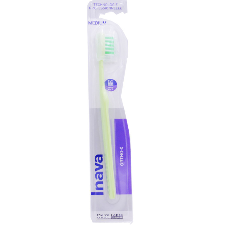 INAVA est une marque engagée depuis de nombreuses années auprès des professionnels de la santé et de l’hygiène bucco-dentaire. INAVA développe des accessoires de brossage de très haute technicité : brosses à dents (hygiène quotidienne, brosses spécifiques, enfants), brossettes interdentaires, fil dentaire… La gamme des brosses à dents pour soins quotidiens offre la qualité et la technologie INAVA pour les soins d’hygiène bucco-dentaire du quotidien. La brosse à dents INAVA Ortho-X Médium est constituée de brins en X, une technologie innovante qui va permettre le brossage des bagues et zones difficile d’accès. De part sa technologie il est recommandé pour les personnes porteur d’appareil orthodontique afin de leur offrir une hygiène bucco-dentaire optimale.
