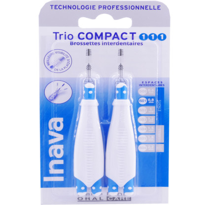 Les Brossettes Trio Compact discount d’INAVA, les brossettes pour espaces inter-dentaires étroit de 0.8 mm spécialement conçues pour éliminer la plaque dentaire dans les zones difficiles d’accès, en ligne dans votre parapharmacie discount.