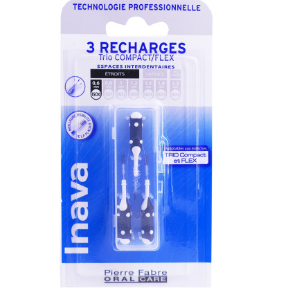 Le lot Recharges Trio Compact/ Flex discount d’INAVA, les recharges pour espaces inter-dentaires étroits de 0.6 mm qui s'adaptent sur les manches TRIO COMPACT ou FLEX, en ligne dans votre parapharmacie discount.