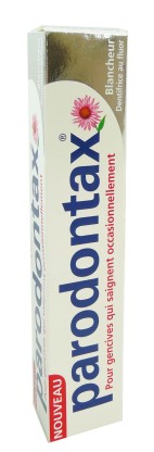 La gamme PARODONTAX du laboratoire GSK (GlaxoSmithKline ou Santé Grand Public) est composée de produits d’hygiène bucco-dentaire : dentifrices, bains de bouches.Le dentifrice composé de bicarbonate de sodium, de sels minéraux, d’actifs végétaux et de fluor, nettoie les dents en profondeur tout en douceur, élimine les taches et la plaque dentaire, lutte contre l’apparition des caries, protège les gencives sensibles en les renforçant et diminuent les saignements.Jour après jour, les gencives sont plus fortes et les dents retrouvent leur blancheur.Son goût à la Menthe, Myrrhe, Camomille, Echinacée, Sels minéraux, Ratanhia, Sauge, laissera l’haleine fraîche pour longtemps.