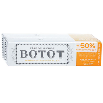 Découvrez le lot de 2x75ml de la pâte dentifrice Botot au délicieux goût Anis Citrus Réglisse, en vente en ligne sur le site de votre parapharmacie à prix discount. Offrez à votre sourire une fraîcheur incomparable et une protection optimale au quotidien.