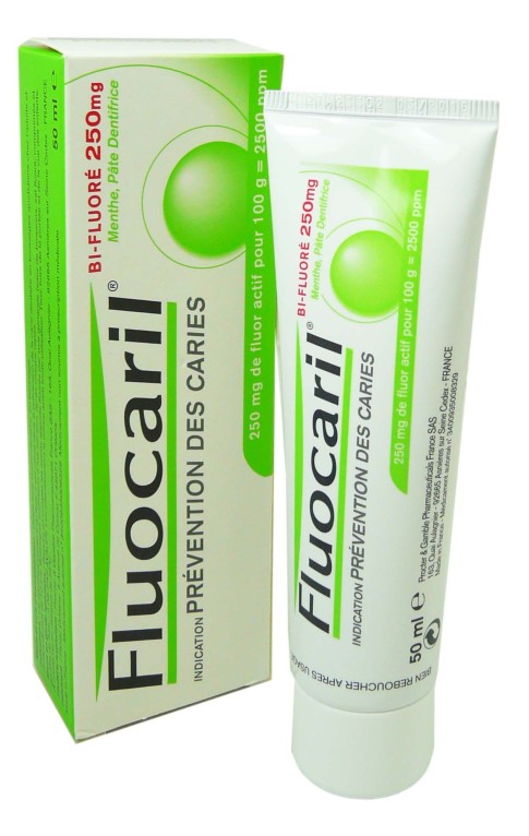 Ce médicament est un produit actif et peut entrainer chez certaines personnes des effets non souhaités et gênants. Demander un avis médical en cas d’effet non souhaité, ou si certains effets indésirables s’aggravent. FLUOCARIL BI-FLUORE 250mg Menthe contient du parahydroxybenzoate de méthyle qui peut provoquer de l’eczéma et exceptionnellement, des réactions allergiques avec urticaire et gêne respiratoire. FLUOCARIL BI-FLUORE 250mg Menthe contient du benzoate de sodium qui peut provoquer une irritation des muqueuses. Composition : Substances actives : Monofluoropriosphate de sodium 0,7600g, Fluorure de sodium 0,3315g pour 100 g. Autres substances : Benzoate de sodium, Laurysulfate de sodium, Phosphate disodique, Hexamétaphosphate de sodium, silice Neubourg, silice pure précipitée, carraghénate de sodium, sorbitol à 70 % non cristallisable, saccharine sodique, huile essentielle de menthe poivrée rectifiée (italo-mitcham), huile essentielle de badiane rectifiée, menthol, phénol officinal, eugénol, huile essentielle de cannelle de Ceylan, dioxyde de titane, parahydroxybenzoate de méthyle, eau purifiée