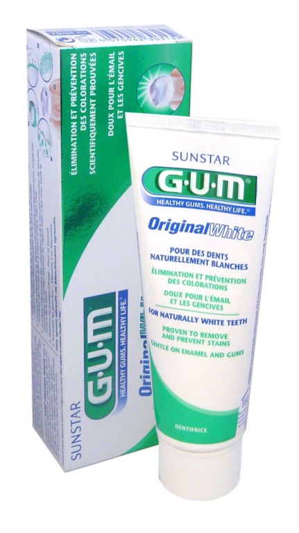 GUM Sunstar, dont le nom évoque le soleil (sun) et les étoiles (stars) puisqu’on se lave les dents au lever du jour et à la tombée de la nuit, développe depuis près d’un siècle des produits de soins buccaux et dentaires révolutionnaires de très grande qualité offrant une réponse adaptée à tous les besoins : brosses à dent, soins inter-dentaires, fils dentaires... La gamme GUM Original White propose des produits spécialement conçus pour rétablir la blancheur naturelle des dents. Le dentifrice GUM Original White élimine efficacement les taches dentaires (café, tabac, vin…) et prévient leur réapparition. Sa formule innovante associe un agent breveté Stain Clear et de la silice micronisée pour gommer en douceur les colorations, une combinaison fluor/isomalt pour protéger l’émail dentaire, de la pro-vitamine B5 et de la vitamine E pour revitaliser les gencives.