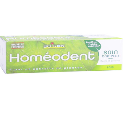 Le laboratoire BOIRON conçoit des médicaments homéopathiques, de soins d’hygiène pour toute la famille et des produits de santé animale.Le dentifrice Homéodent Soin Complet Dents et Gencives est un dentifrice à base d’extraits de plante (Calendula, Hamamelis, Grand Plantain, Raifort Sauvage) et de fluor. Les plantes sont récoltées à la main pour conserver tout leurs bienfaits naturels. Un soin complet qui va nettoyer les dents en douceur, réduire la plaque dentaire, protéger et renforcer l'émail des dents contre les agressions et prévenir la présence de bactéries cariogènes. Après chaque brossage, les dents sont propres et l'haleine fraîche.