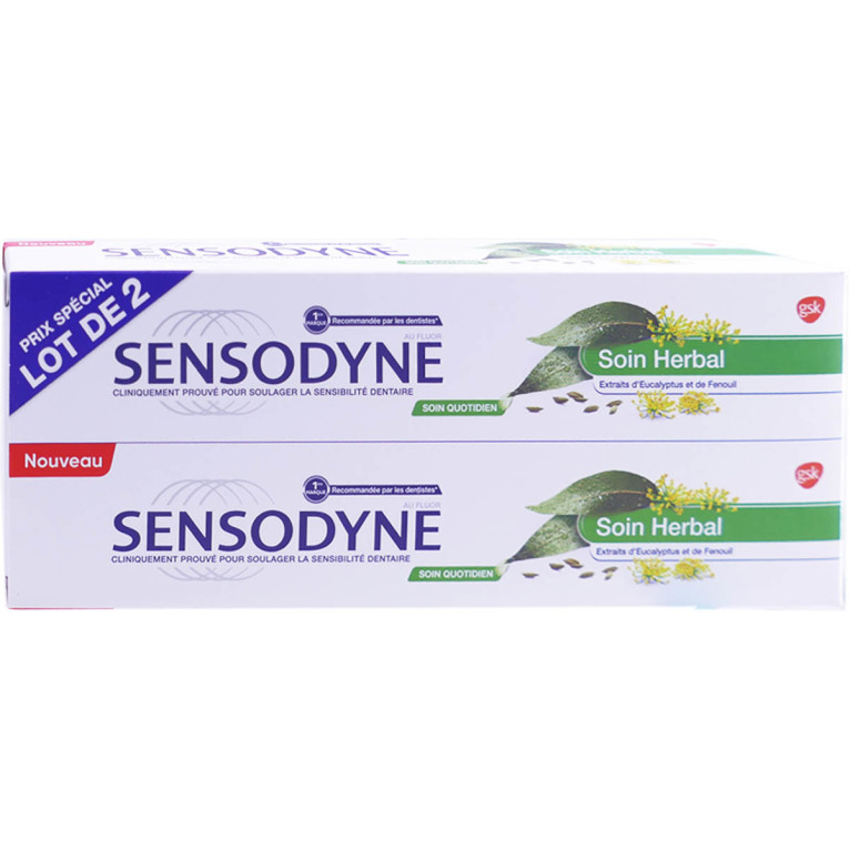 SENSODYNE DENTIFRICE SOIN HERBAL LOT DE 2X75ML - Dentifrice pour dents sensibles en vente en ligne, sur le site de votre parapharmacie à prix discount. Découvrez le dentifrice SENSODYNE DENTIFRICE SOIN HERBAL 75ML, spécialement conçu pour les personnes ayant des dents sensibles.