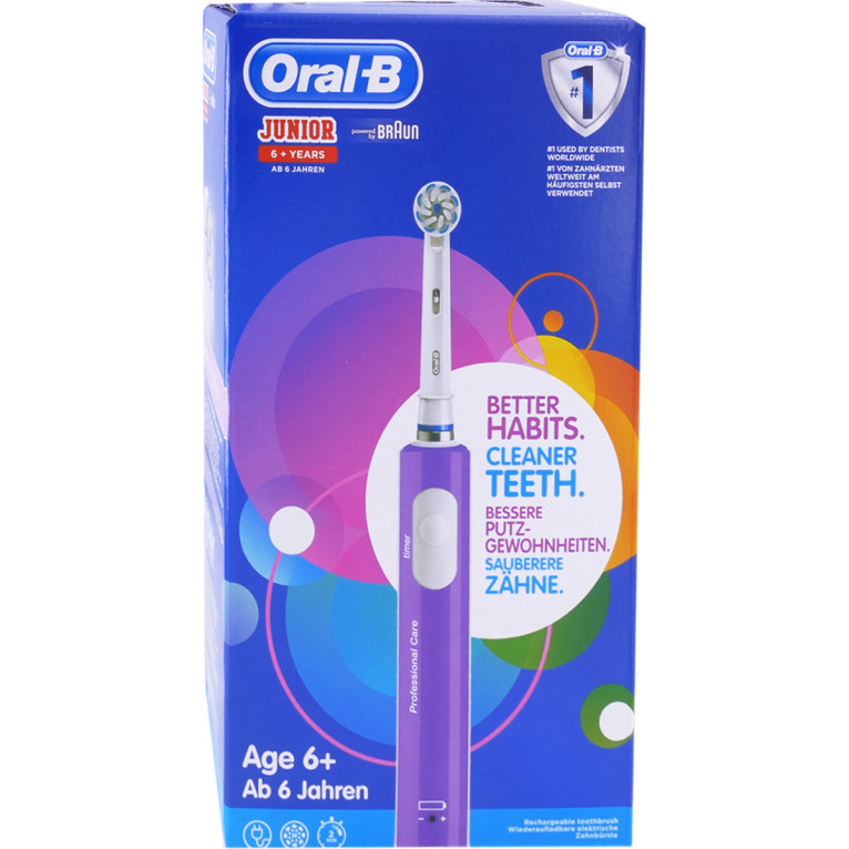 Couleurs selon disponibilités (Violet ou Vert). L’emballage contient : Une brosse à dents électrique pour enfants avec manche rechargeable et une brossette de rechange Sensi Ultra-Thin. La brosse à dents électrique Oral-B Junior 6+ est compatible avec les brossettes de rechange suivantes : Cross Action, 3D White, Sensi Ultrathin, Sensitive Clean, Precision Clean, Floss Action, Tri Zone, Dual Clean, Power Tip et Ortho Care.