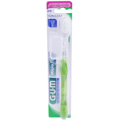 GUM Sunstar, dont le nom évoque le soleil (sun) et les étoiles (stars) puisqu’on se lave les dents au lever du jour et à la tombée de la nuit, développe depuis près d’un siècle des produits de soins buccaux et dentaires révolutionnaires de très grande qualité offrant une réponse adaptée à tous les besoins : brosses à dent, soins inter-dentaires, fils dentaires... La gamme GUM Prévention quotidienne propose des produits spécialement conçus pour maintenir des dents et des gencives saines et en bonne santé. La brosse à dents GUM Micro Tip nettoie tout en douceur les dents sensibles et gencives fragiles pour éliminer la plaque dentaire. GUM innove par la technologie Micro Tip en élaborant au bout de chaque brin ultrasouple de la brosse à dents des 2 rangées centrales 4 à 6 brins supplémentaires, afin d’améliorer le brossage 70% de plus qu’une brosse à dents ordinaire. Les 2 rangées centrales surélevées par leur coupe en dôme vont éliminer plus efficacement la plaque dentaire au niveau du sillon gingivo-dentaire. La forme de tête de brosse aux contours arrondis épousent l’arcade dentaire pour un passage efficace entre les dents. Son manche antidérapant ergonomique avec butée de préhension permet une bonne prise en main pour un brossage optimal.