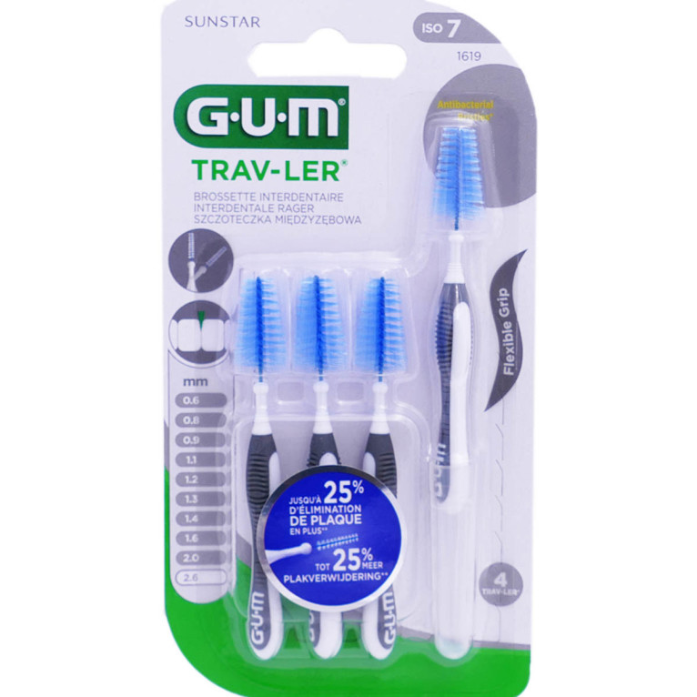 Les brossettes interdentaires GUM Trav-ler discount, des soins professionnels dans votre parapharmacie en ligne à prix discount, pour des gencives en bonne santé une réduction optimale de la plaque dentaire. Taille 7 : Espaces interdentaires larges de 2,6mm