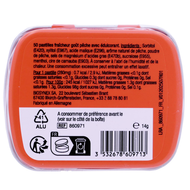50 pastilles fraîcheur goût pêche avec édulcorant sorbitol (E420), acide malique (E296), xylitol (E967), sels de magnésium d'acides gras (E470b), poudre de pêche, arômes naturels de pêche, sucralose (E955), menthol, cire de carnauba (E903).