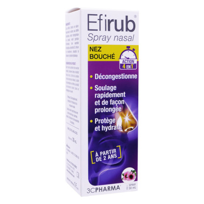 3C PHARMA EFIRUB NEZ BOUCHÉ SPRAY NASAL 30ML est un dispositif médical en vente en ligne, sur le site de votre parapharmacie à prix discount, idéal pour soulager la congestion nasale. A partir de 2 ans