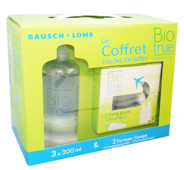 La solution multifonctions Bio True de BAUSH&LOMB nettoie et décontamine les lentilles de contact souples et en silicone hydrogel. La solution stérile en flacons, nettoie, décontamine en éliminant les protéines, hydrate, rince, et lubrifie naturellement, grâce à l’acide hyaluronique et borique. Elle permet également de rincer les lentilles en éliminant tous les dépôts résiduels et conserver les lentilles grâce à son étui inclus avec le flacon. Son pH équilibré est identique à celui des larmes pour une tolérance oculaire optimale. Après le nettoyage, les lentilles sont comme neuves pour un port confortable tout au long de la journée. Pratique les flacons en petit format peuvent être emmenés partout même lors de voyage en avion (autorisé en bagages à main) avec le sac zippé.