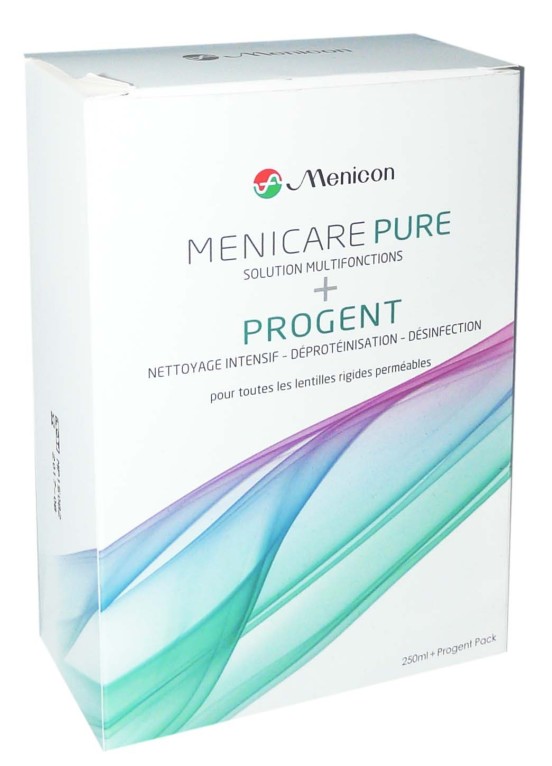 La solution multifonctions MENICARE PURE stérile en flacon, à base de polylysine, vitamine C glucoside et acide hyaluronique, nettoie, décontamine en éliminant les micro-organismes et champignons, lubrifie et rince. Elle permet également de conserver les lentilles grâce à l’étui inclus avec le flacon. Dès 30 minutes, les lentilles sont débarrassées des micro-organismes. Après 4 heures de trempages dans l’étui, les lentilles sont débarrassées des amibes. La solution PROGENT en double dose (dose A et dose B) à base de solution d’hypochlorite de sodium (NaCIO) 20,30 mg, de bromure de potassium (KBr 30,75 mg et d’eau purifiée q.s.p 5 ml, va déprotéiniser les lentilles, nettoyer, décontaminer en seulement 5 minutes (bactéries, champignons, vtrus et amibes) et éliminer les prions (9).