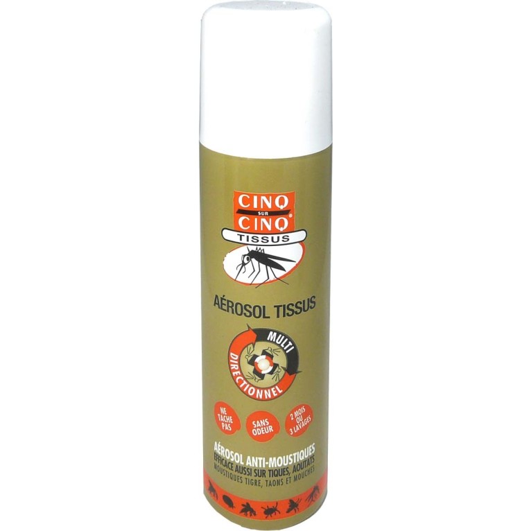 L’Aérosol Tissus Anti-moustiques CINQ SUR CINQ discount, un produit répulsif dans votre parapharmacie en ligne à prix discount, pour éloigner les moustiques et autres insectes piqueurs à travers les tissus de grande surface.