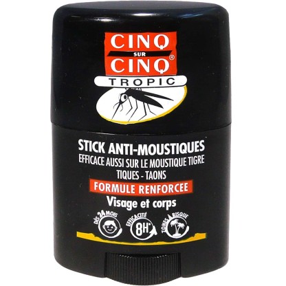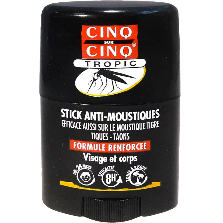 Stick Anti-moustiques Formule renforcée CINQ SUR CINQ dans votre parapharmacie en ligne discount, la solution protectrice pour éloigner les moustiques, les taons, et les tiques. Adapté à toute la famille (dès 24 mois) et aux femmes enceintes. Zones à risques