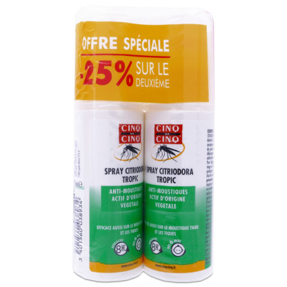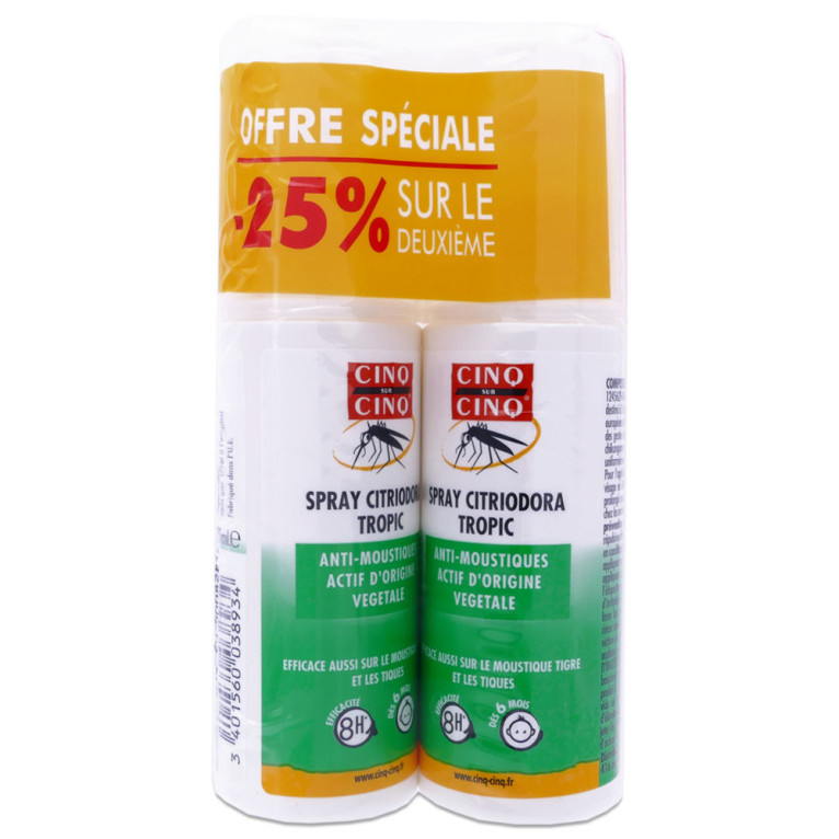 Optez pour CINQ SUR CINQ SPRAY CITRIODORA TROPIC 2X100ML, une solution idéale pour votre routine quotidienne, vous permettant de profiter pleinement de vos activités extérieures en toute sérénité.