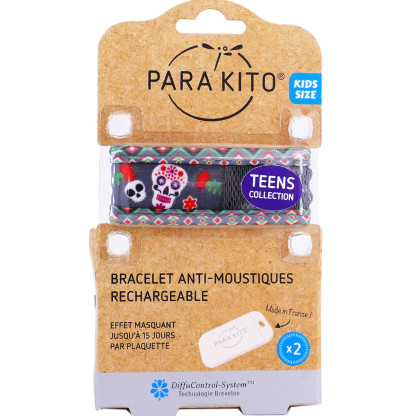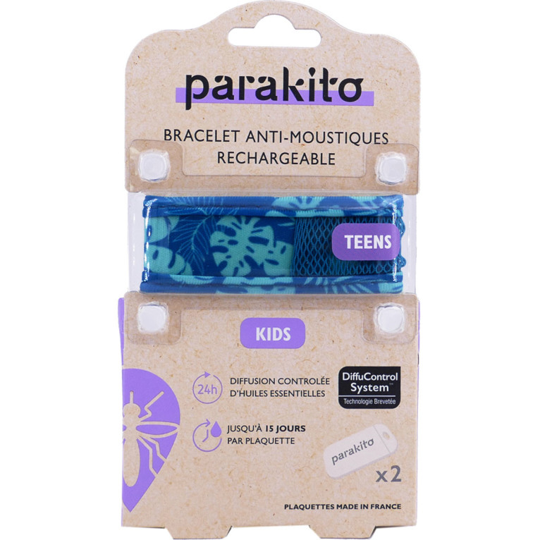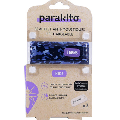 Ce bracelet anti-moustique de PARA'KITO Kids doté de la technologie breveté DiffuControl-System est composé d'huiles essentielles d'origine végétale (géranium, romarin, menthe, citronnelle, menthe poivrée, girofle, écorce de cannelle) qui va permettre d'éloigner les moustiques pour protéger pendant 15 jours de leurs piqûres (en port continu) dans toutes les zones et tous climats. Il peut se porter aussi bien à la cheville qu'au poignet. Ses couleurs et motifs plairont aux enfants ! La plaquette est placée sous le filet du bracelet et ainsi évite tout risque d'allergies ou de frottement direct avec la peau. Très résistant à l'eau, ajustable et facile à mettre et à enlever par sa fermeture en velcro. Le bracelet PARAKITO Kids est rechargeable (recharges vendues séparément).