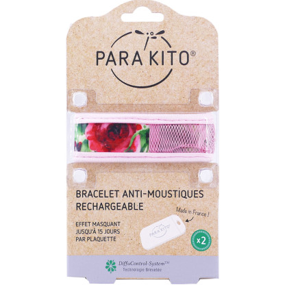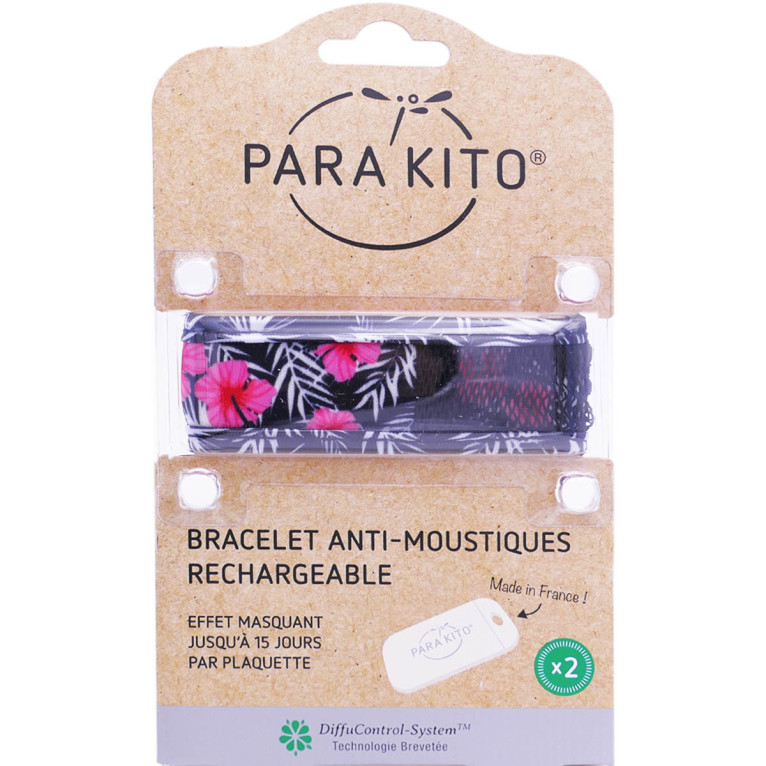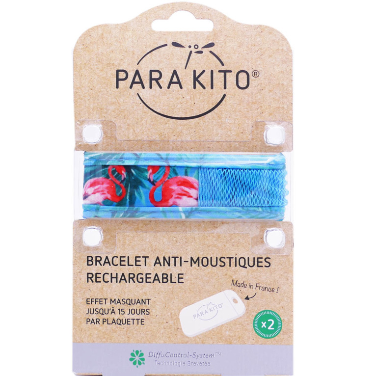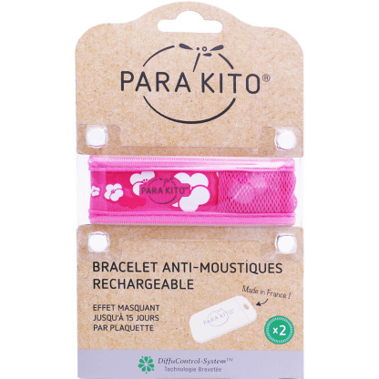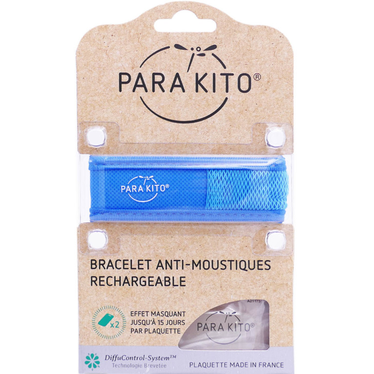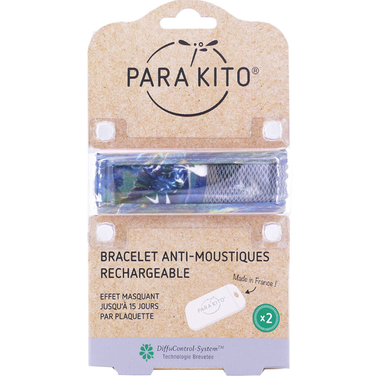 Le bracelet anti-moustique rechargeable de PARA’KITO doté de la technologie breveté DiffuControl-Systemest composé d'huiles essentielles d'origine végétale (Huile essentielle de Cassia, Romarin, Menthe des champs, Geraniol, Litsea cubeba ) qui va permettre d'éloigner les moustiques pour protéger pendant 15 jours de leurs piqûres (en port continu) dans toutes les zones et tous climats. Il peut se porter aussi bien à la cheville qu'au poignet, ses couleurs et motifs plairont aux grands ! Ses 2 plaquettes sont placées sous le filet du bracelet et ainsi évite tout risque d'allergies ou de frottement direct avec la peau. Très résistant à l'eau, ajustable et facile à mettre et à enlever par sa fermeture en velcro. Le bracelet PARAKITO est rechargeable (recharges vendues séparément).