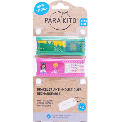 Ce bracelet anti-moustique de PARA'KITO Kids doté de la technologie breveté DiffuControl-Systemest composé d'huiles essentielles d'origine végétale (Huile essentielle de Cassia, Romarin, Menthe des champs, Geraniol, Litsea cubeba ) qui va permettre d'éloigner les moustiques pour protéger pendant 30 jours de leurs piqûres (en port continu) dans toutes les zones et tous climats. Il peut se porter aussi bien à la cheville qu'au poignet, ses couleurs et motifs plairont aux enfants ! Ses 2 plaquettes sont placées sous le filet du bracelet et ainsi évite tout risque d'allergies ou de frottement direct avec la peau. Très résistant à l'eau, ajustable et facile à mettre et à enlever par sa fermeture en velcro. Le bracelet PARAKITO Kids est rechargeable (recharges vendues séparément).