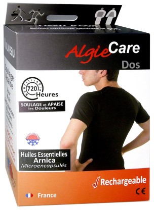 ALGIE Care sont des solutions naturelles à base d’huiles essentielles et d’extrait d’arnica micro encapsulées, sous forme d’orthèse, genouillère, tee-shirt,… pour soulager diverses douleurs par des fibres synthétiques en polyester. Le T-shirt est composé d’une fibre polyester qui contient de la zircone (oxyde de zirconium) à l’effet thermique en nano-particules d’oxyde de zirconium fixé sur le tissu, des microcapsules composées d’huile essentielle de gaulthérie et des extraits d’arnica pour des actions antalgiques et antiinflammatoires. En se libérant au contact de la peau par frottements et en compressant légèrement sur le dos, ces actifs d’origine 100% naturels micro encapsulés vont soulager les douleurs instantanément au niveau du dos pour retrouver du confort. Le T-shirt de couleur noire peut être porté jour et nuit pour une efficacité longue durée, avant pendant ou après un effort. Le T-shirt est efficace pendant 720 heures même si il n’est pas porté en continu. Rechargeable avec la solution en spray ALGIE, le débardeur est réutilisable à volonté. Il peut être lavé à 40°C pour une utilisation longue durée et être séché sur cintre.
