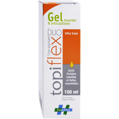 Topiflex Duo Gel Muscles & Articulations est un gel spécialement destiné au soulagement des douleurs musculaires et articulaires rapidement et pour longtemps du corps (nuque, dos, poignet, cuisse, pieds). Composé d’harpagophytum, arnica et saule, les articulations retrouveront leur souplesse et la récupération musculaire sera améliorée. L’huile essentielle de gaulthérie et le camphre procureront bien-être musculaire et articulaire. Ce gel à l’effet froid, utilisé en massage pour allier les bénéfices du produit à ceux du mouvement procureront un effet froid instantané apaisant. Ce gel réduit rapidement l’intensité de la douleur. Sa texture non grasse pénètre rapidement à l’application. Testé sous contrôle dermatologique, Sans paraben