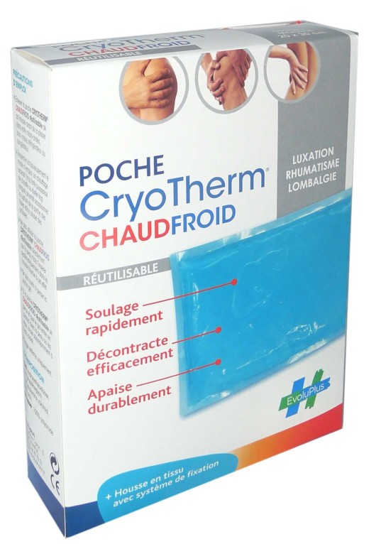 La poche Chaud-froid réutilisable soulage lors de coups (œdèmes, bosses, hématomes,...), d'inflammations, entorse, luxation, douleurs musculaires, torticolis...Souple, il épouse la forme du corps. Le coussin peut être : chauffé au micro-ondes ou dans de l’eau frémissante pour une action chaude en cas d’inflammation et contractures musculaires, torticolis, rhumatisme non inflammatoire ; frais et froid au réfrigérateur ou au congélateur pour une action froide en cas d’œdèmes, entorse, luxation, tendinite, claquage,…. Son système de fixation permet de maintenir la poche en toute sécurité. La housse permet de mettre la poche pour éviter le contact direct avec la peau.