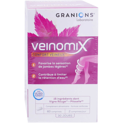 Veinomix des laboratoires GRANIONS à prix discount, le complément alimentaire qui soulage les inconforts liés aux jambes lourdes et fatiguées dans votre parapharmacie en ligne, pour redonner de la légèreté et lutter contre la rétention d’eau. Complément alimentaire