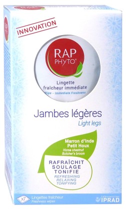 Depuis 1989, les Laboratoires IPRAD développent des produits de santé et de bien-être, formulés de façon à offrir efficacité et sécurité grâce à une sélection rigoureuse des actifs les plus doux possibles pour l’organisme. Les lingettes jambes légères de RAP Phyto fluidifient la microcirculation sanguine dans les jambes pour redonner une sensation de légèreté aux jambes lourdes et les rafraîchit pour retrouver tout le confort. Pratique par leur format individuel, ces lingettes biodégradables s’emportent partout avec soi pour une utilisation à tout moment.
