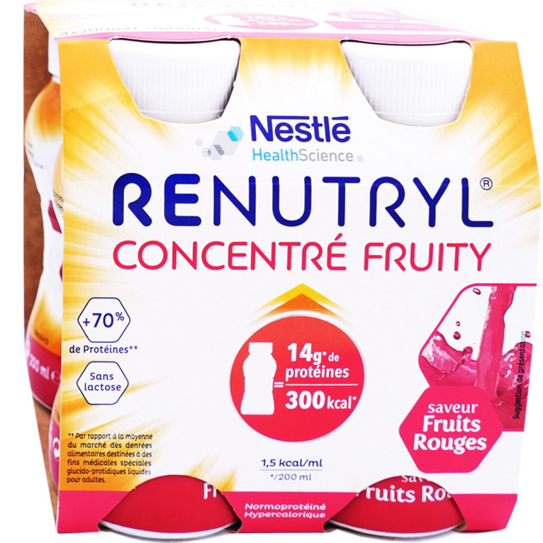 RENUTRYL Concentré Fruity est une boisson aromatisée hyperprotéinée et hypercalorique indispensable lors de dénutrition ou pour les personnes en risque de dénutrition. Elle a été conçue pour prendre en charge la perte de poids dans des situations d'apports alimentaires insuffisants. Elle contient 14g de protéines pour 200ml . Ce vrai concentré d’énergie et de protéines est parfaitement adapté aux personnes âgées dénutries. RENUTRYL Concentré Fruity contient des protéines de lait, et est sans lactose, sans gluten ni lipides. Avec son goût fruité, cette boisson sera agréable à prendre !