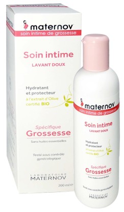 Le laboratoire MATERNOV propose des compléments alimentaires et produits à base exclusivement d'ingrédients naturels pour la bonne santé de la future maman, contrôlé par des gynécologues, obstétriciens, sages-femmes et pharmaciens. Soin intime spécial grossesse est un soin lavant très doux, qui nettoie tout en douceur, protège la surface de la peau et l’hydrate, renforce le film hydrolipidique de la flore intime pour mieux lutter contre le développement des bactéries et la sècheresse responsables des désagréments intimes, adoucit et calme grâce à sa richesse en allantoïne, extrait d’olive bio et d’eau florale de rose bio. Son pH physiologique permet un nettoyage tout en douceur sans agresser les parties intimes fragiles.