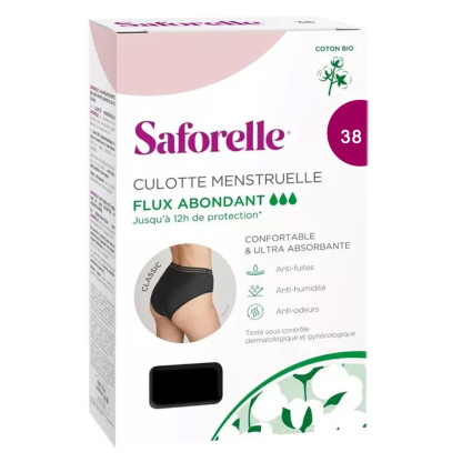 La Culotte menstruelle Saforelle flux abondant, est une culotte en coton bio à mettre en prévision et pendant des règles. Cette culotte discrète et confortable est constitué d’une protection anti-fuite et anti-humidité qui permet une absorption optimale pour les femmes qui ont un flux très abondant. La culotte vous garantit une protection pendant 12 H peut importe votre flux sanguin. Lavable en machine, elle garde sa capacité d’absorption jusqu’à plusieurs lavages. Très douce, la culotte ne contient pas d’absorbant chimique et est hypoallergénique pour une tolérance de la zone intime optimale. Elle ne cause également pas d’odeurs désagréable. Testé sous contrôle dermatologique et gynécologique. Les tailles sont variées puisqu'elles vont du 34 au 40.