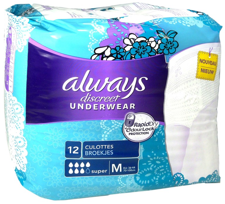 Les culottes Incontinence d’ALWAYS DISCREET Super protègent lors de fuites urinaires conséquentes et imprévisibles en toute sécurité et confortablement. Taille M (36-44).