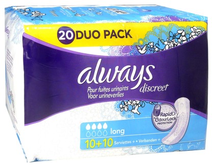Les serviettes+ Discreet Long d’ALWAYS protègent lors de fuites urinaires fréquentes et modérées en toute sécurité.