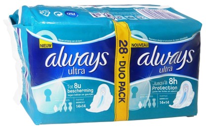 Le laboratoire ALWAYS conçoit des produits d’hygiène féminine destinée aux femmes pour un quotidien en toute sérénité au quotidien et lors des périodes menstruelles. Très absorbantes, elles ne laissent pas d’odeur désagréable grâce à leur fraîcheur durable plus performante que les serviettes Ultra précédentes, et la technologie cœur bleu Super Absorbant™ qui transforme le liquide menstruel en gel pour une protection maximale. Leur voile protecteur agréable est doux comme du coton sans risque d’irritations ou d’inconforts. La technologie SuperFit avec des ailettes sur les côtés permet aux serviettes de rester bien en place dans la lingerie et les contours de protection Secureguard évitent les fuites sur les côtés en gardant le flux au centre des serviettes. Toute la journée les serviettes laissent une sensation de fraîcheur pour une totale protection. Pratique leur emballage individuel permet d’emporter en toute discrétion les serviettes périodiques.