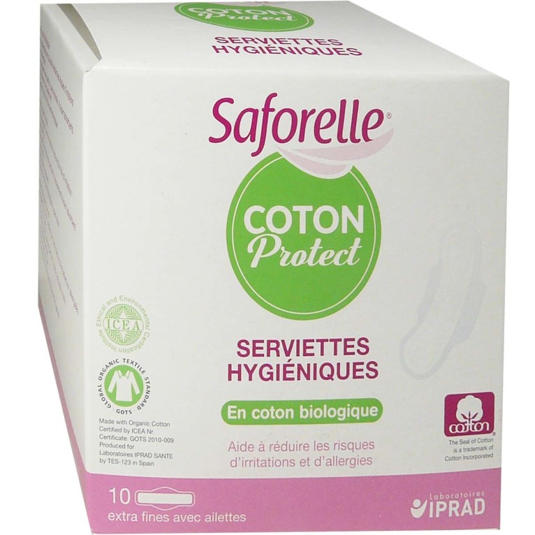 . Afin de répondre aux besoins spécifiques de la sphère intime féminine, SAFORELLE a développé une gamme de protections périodiques conçus avec du coton biologique, destinés à prendre soin de la flore vaginale : COTON PROTECT. Très fines avec ailettes les serviettes hygiéniques Coton Protect sont très discretes sous les vêtements et ne gênent pas dans les mouvements par leur forme anatomique. Le voile au cœur très absorbant, permet de limiter les mauvaises odeurs. Hypoallergénique et testés cliniquement, les serviettes hygiéniques laissent la peau respirer et la préserve de toute allergie ou irritations grâce à leur voile très doux 100% coton bio qui laisse la peau respirée. Elles sont dotées d’ailettes qui permettent d’être maintenues dans la lingerie. Pratique, les serviettes hygiéniques sont dans des sachets individuels pour être transportés en toute discrétion.