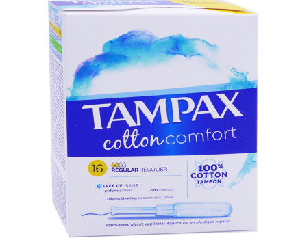 La marque TAMPAX 1ère marque de tampons, propose une large gamme de tampons répondant à tous les besoins hygiéniques en matière de taille, d’intensité de flux, avec ou sans applicateur… Dotés d’un voile protecteur absorbant composé à 100% de coton issu de filières responsables, les tampons TAMPAX Comfort Régulier s’insèrent tout en douceur et se mettent en place facilement, tout en retenant le liquide à l’intérieur du tampon pour une sécurité maximale. Il est doté d’une tresse anti-fuite LeakGuard à la base du tamponet d’une tresse de renfort qui prévient les fuites pour une utilisation optimale. La technologie MotionFit permet au tampax de rester discret en épousant parfaitement la forme du corps. L’applicateur en plastique végétal (90%) à l’embout arrondi permet une insertion plus facile. Les tampons TAMPAX Comfort Régulier ne contiennent pas de parfum, colorant ni blanchiment au chlore.